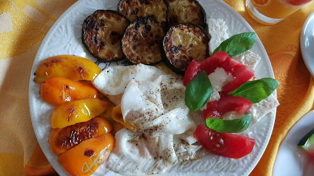 feta lub grube plastry twarogu z pomidorami i bazylią