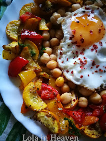 Na talerzu układam cieciorkę, na niej sadzone jajko, a naokoło paprykę i cukinię.