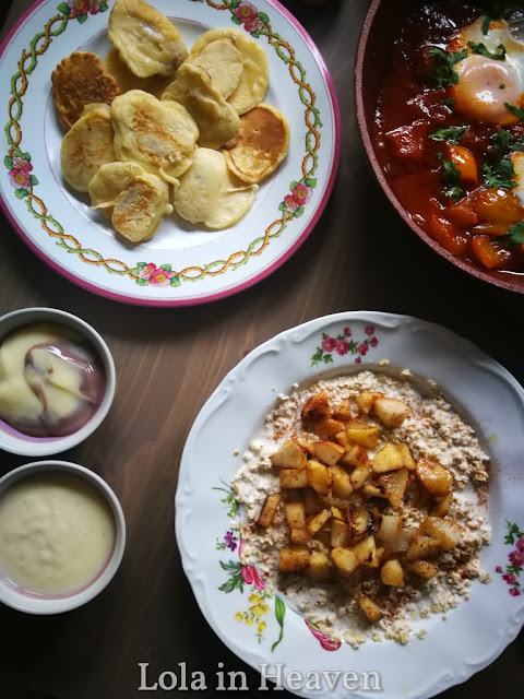 Ziemniaki i marchewkę kroję w kostkę, podsmażam w niewielkiej ilości oleju. Po lekkim zrumienieniu dodaję koncentrat pomidorowy, pokrojoną w pióra cebulę posiekany czosnek i przyprawy Mieszam wszystkie składniki i podsmażam przez 2-3 min. Następnie dodaję szklankę wody, ponownie mieszam i w końcu wlewam wodę do przykrycia warzyw. Gotuję przez 10 min, po czym wbijam po 1 jajku na osobę. Od ilości dodanej wody zależy konsystencja potrawy. Pozostawiam pod przykryciem do ścięcia białka. Wierzch posypuję świeżą natką pietruszki oraz dodaję oliwki.