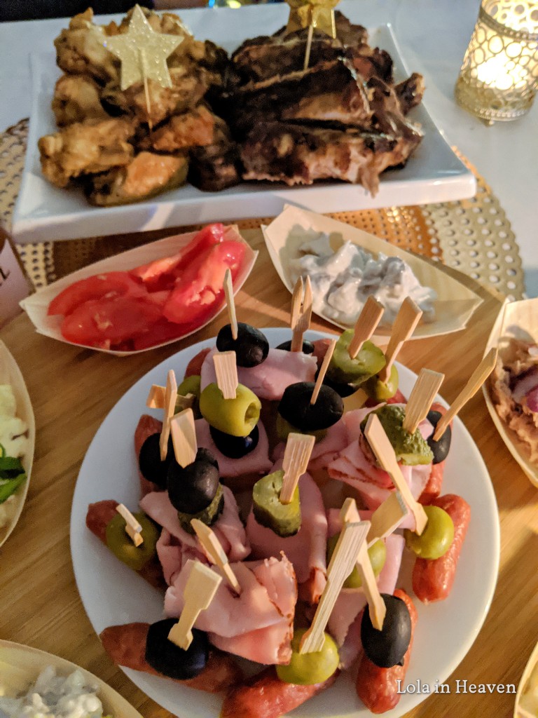 koreczki z sera, szynki, salami iogórków konserwowych i oliwek